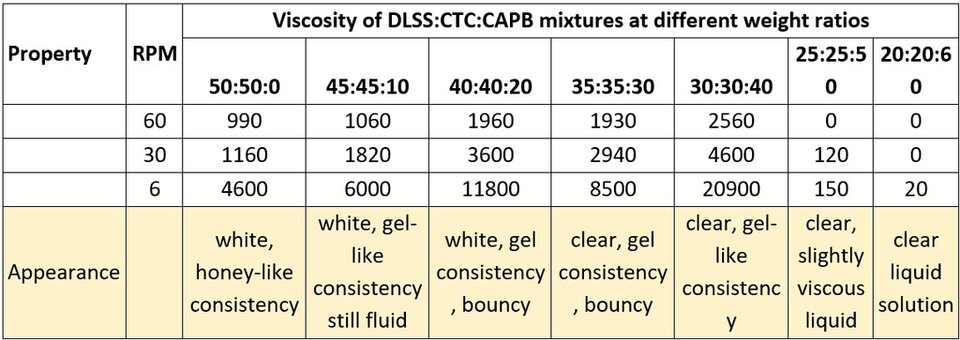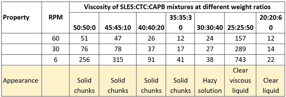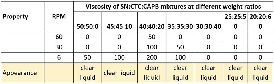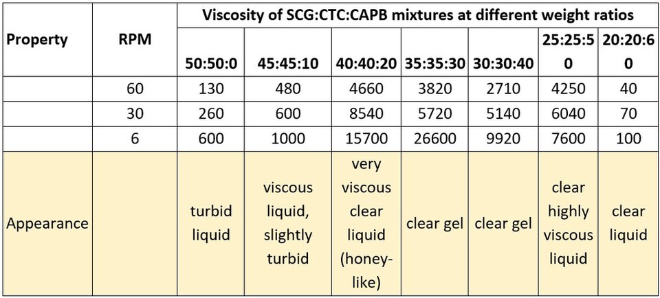 Table 3. Viscosity of SCG:CTC:CAPB mixtures at different ratios.