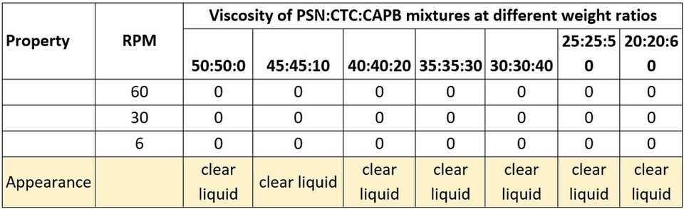 Table 4. Viscosity of PSN:CTC:CAPB mixtures at different ratios.