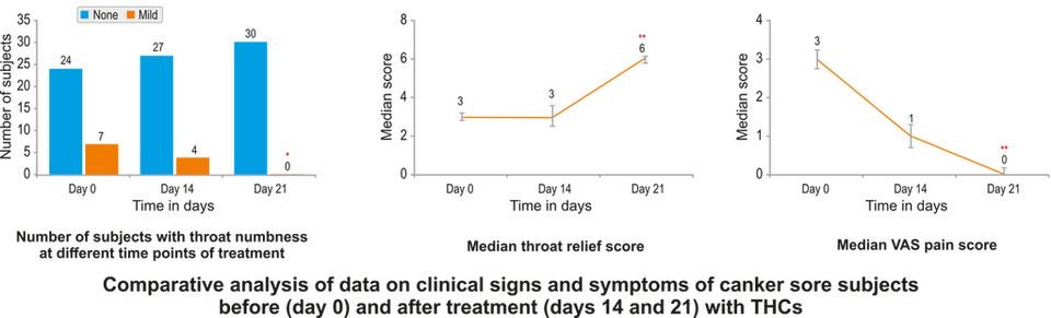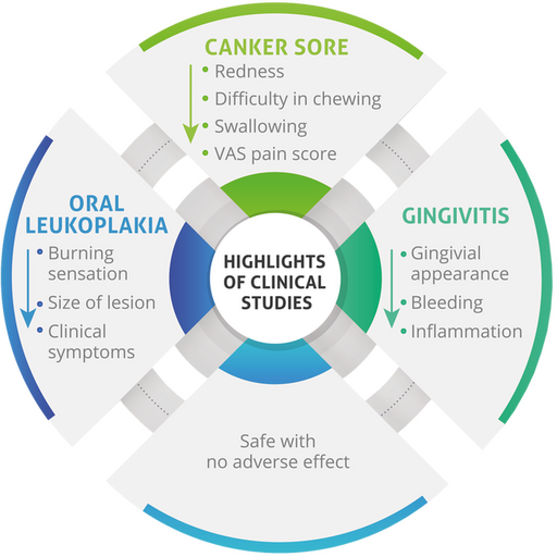 Two clinical studies have confirmed the effectiveness of C3 Reduct® in oral care, found it to be safe and effective in the management of gingivitis, canker sore, and oral leukoplakia. In an open label, prospective, two arm clinical trial involving 30 subjects with canker sores (painful ulcers in the mouth or at the base of the gums) and 29 subjects with gingivitis (a gum disease associated with bleeding), supplementation with 100 mg chewable tablet of C3 Reduct® twice daily for 3 weeks showed remarkable improvement. In canker sore individuals, supplementation with C3 Reduct® resulted in a significant reduction in redness, burning sensation, and throat numbness within 14 days and after the end of the study. In addition, throat pain, difficulty in chewing/swallowing, and VAS pain score were also relieved in these individuals with the disappearance of both single and multiple lesions.