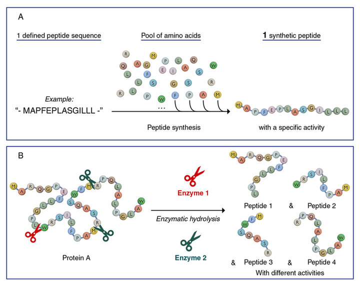 Figure 2. Schematic representation of the obtention of synthetic peptide (A.) and natural peptides (B.). This schematic representation is for illustrative purposes only and does not represent quantitative data.