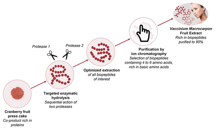In this context, SILAB has decided to explore the molecular richness of cranberry fruit press cakes. This superfruit is known for its nutritional value and benefits for health. Enzyme engineering and purification expertise have been beneficially used to offer a peptide concentrate combining richness and performance. The sequential action of two proteases specifically selected has enabled the optimized extraction of all the peptides of interest present in this cranberry co-product. The use of molecular sorting combined with purification by ion exchange chromatography on resin enables the active fraction to subsequently be concentrated in natural peptides particularly rich in arginine (Figure 3). This unique patented process led to the development of the Vaccinium Macrocarpon Fruit Extract.