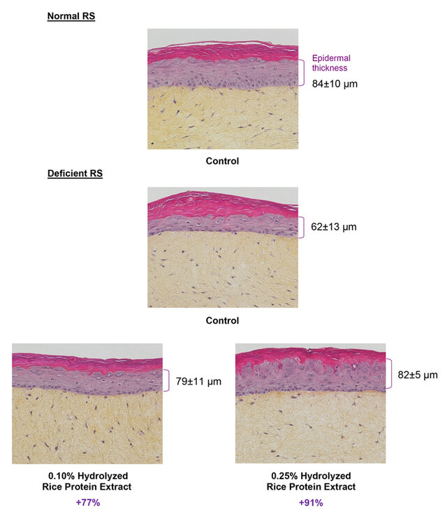 Results show that, tested at 0.25%, the Hydrolyzed Rice Protein Extract significantly increases thickness of the epidermis by 19% in normal reconstructed skin and significantly returns thickness of the epidermis to normal in deficient reconstructed skin (+91%).