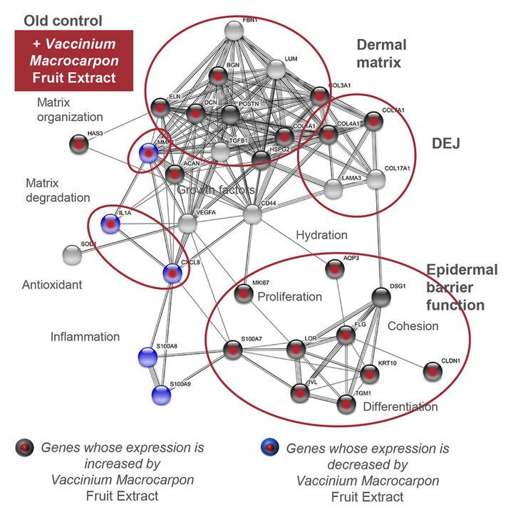 With the Vaccinium Macrocarpon Fruit Extract Expression the expression of 81% of deregulated cutaneous homeostasis genes is normalized compared to old cells control. Indeed, tested at 0.5% on old keratinocytes, it significantly regulates the expression of genes related to proliferation (Ki-67: +41%), differentiation (loricrin: +75% and filaggrin: +47%), cohesion (claudin-1: +30%), and anti-free radical defense (SOD1: +12%). Tested at 0.5% on old fibroblasts, it also has a significant action on the expression of genes related to matrix organization (collagen I: +24% and elastin: +28%) and its degradation (MMP-1: -37%) (Figure 4).
