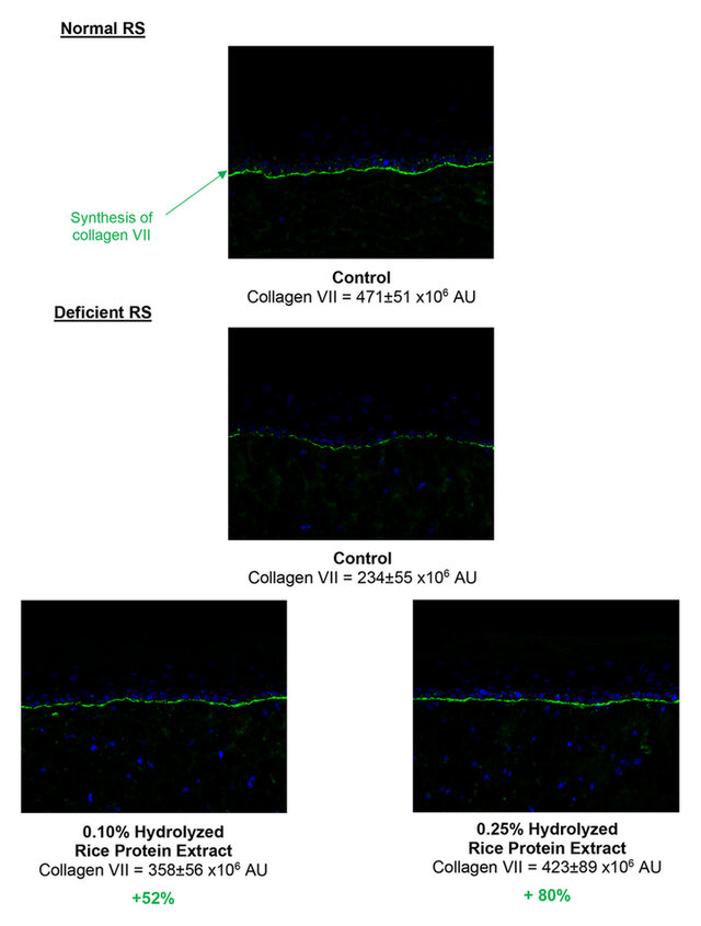 Reconstructed skin was grown in the presence of the Hydrolyzed Rice Protein Extract in culture medium depleted to varying extents. The efficacy of the product was examined by analyzing the synthesis of procollagen I by ELISA assay, of fibrillin-1 (a marker of the dermal matrix) and of collagen VII (a marker of the dermal-epidermal junction) by immunohistological labeling.