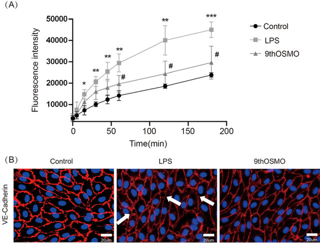 Figure 2. Effect of 9thOSMO on endothelial hyperpermeability induced by LPS. (A) FITC-dextran transport in the lower compartment was measured at the end of LPS stimulation; (B) Integrity of cell–cell contacts evaluated by immunofluorescence analysis of VE-Cadherin in HUVEC monolayers. Data are the mean±SEM of three independent experiments. “*” indicates a significant difference from the Control (*p<0.05, **p<0.01 , ***p<0.001). “#” indicates a significant difference from the 9thOSMO (#p<0.05).