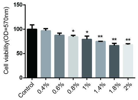 The cytotoxicity of 9thOSMO, which is soluble in the EGM-2,was determined using 3-[4,5-dimethylthiazol-2-y-2,5-diphenyltetrazolium bromide (MTT) reduction to the corresponding. Briefly, cells (6*103 cells/well) were inoculated in 96-well plates for 24h before being exposed to 9thOSMO (0%, 0.4 %,0.6 %,0.8 %,1 %,1.4 %,1.8 %,2 %) in humidified 5 % CO2 at 37 ℃ for 12 h, followed by the addition of reagent containing MTT reagent (10 μL) each well. After 4 h, DMSO (100μL) was added to dissolve the formed formazan salt, and then the absorbance of each well was measured at 570 nm using a microplate reader. Viability was expressed as a percentage of the control, which without any treatment (0% 9thOSMO).