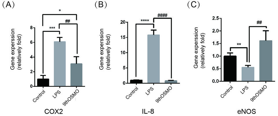 Figure 3. Effect of 9thOSMO on COX-2 (A), IL-8 (B), and eNOS (C) expressions in LPS-treated cells.Data are the mean±SEM of three independent experiments. “*” indicates a significant difference from the Control (*p<0.05 , **p<0.01,***p<0.001, ****p<0.0001). “#” indicates a significant difference from the 9thOSMO (##p<0.01, ####p<0.0001).