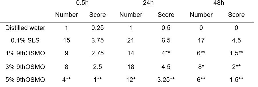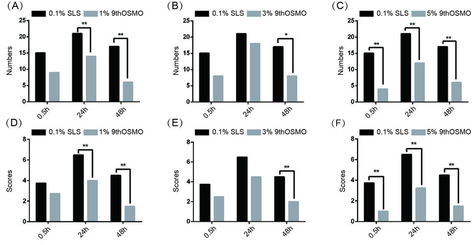 A patch test was performed to evaluate the anti-irritation effect of 9thOSMO for clinical applications to human skin. As shown in Table 2 and Figure 4. 1% 9thOSMO-SLS, the number of adverse reactions was significantly less than 0.1% SLS at 48h, the score of adverse reactions was significantly lower than that of 0.1% SLS at 24h and 48h (Figure 4a and 4d); 3% 9thOSMO-SLS, the number and the score of adverse reactions were both significantly less/lower than 0.1% SLS at 48h(Figure 4b and 4e); 5% 9thOSMO-SLS, number and score of adverse reactions were both significantly less/lower than 0.1% SLS solution at 0.5, 24 and 48h (Figure 4c and 4f).