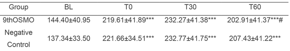Based on the above experiments and considering the effectiveness and cost, this study chose 2% as the applied dose. The skin Soothing effect of 9thOSMO was evaluated in vivo using the MN-induced. The erythema index (EI) significantly increased when exposed to MN. Then with the increase of time, EI showed a trend of first increasing and then decreasing. Relative to the baseline, 60 minutes after applying 2% 9thOSMO, the EI was significantly lower than the negative control (without applying any products) (Table 3 and Figure 5). This indicates that the 2% 9thOSMO has a significant effect in reducing skin redness, and can speed up the rate at which the skin's redness subsides (16.52% vs negative control; 22.20% vs T0).
