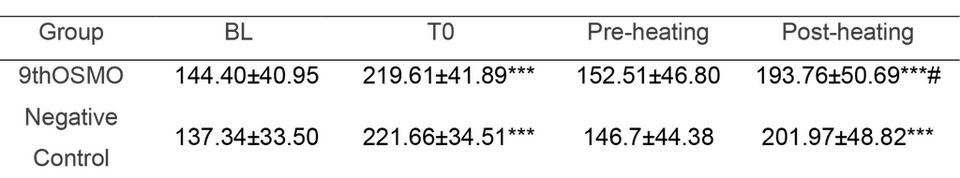 ***p < 0.001 compared with the BL;# p < 0.05, indicates that the difference between before and after-heating compared to the negative control.