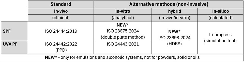 Alternative in-vitro methods to replace in-vivo testing are currently under development, aiming to reduce both the cost and time required for sunscreen efficacy evaluation. While these methods still present some limitations, particularly in achieving consistent correlation across the various types of sunscreen formulations, they represent a promising advancement.