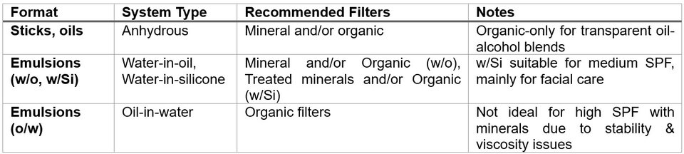 After years of formulating sunscreen products, in my opinion, the recommendation regarding the type of UV filters to be used depends on the formulation system and the intended product format: