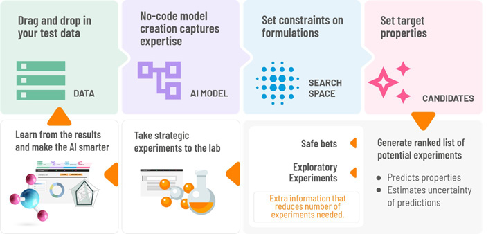 Every time you run an experiment, you can put that data point into the AI and retrain the model to make it more accurate. Even failed experiments are useful, as they teach the AI what doesn’t work. In this way we have a learning loop that gets closer and closer to targets.