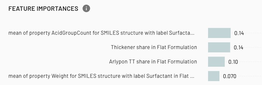 Figure 3. Feature importance visualization – Partial ranked list of the most important features for predicting shampoo viscosity according to the AI model. (Ranked on a scale from 1-0, with 1 the most important)