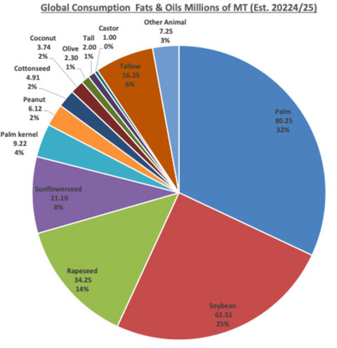 Figure 1 shows that palm and palm kernel together to account for 36% all global oils and fats consumption currently, the largest single source.