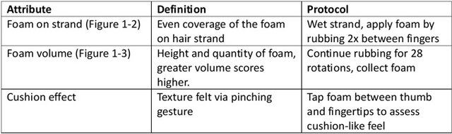 Table 1 below presents the key sensory foam attributes of solid shampoos along with their definitions and standardized protocols for evaluation on hair strands.