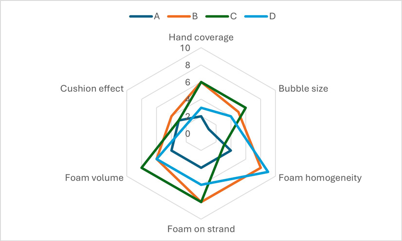 The results are presented in Figure 2. The developed protocol enables to observe clear differences between the products across all descriptors, except for the cushion effect, which remains a challenging attribute to evaluate. The product A based on SCS and shea butter showed the lowest performance in terms of foam quality. In contrast, the solid APG-based product D, despite being a first, non-optimized formulation, already produced a homogeneous foam
