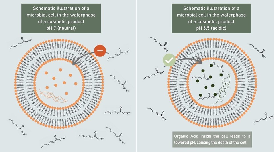 After establishing the pH-dependency of the antimicrobial efficacy of organic acids, it is important to consider the second important factor, the solubility. This is a key factor in formulation technique —after all, what good is a preservative if it doesn’t dissolve properly? As it turns out, for organic acids the solubility is also pH dependent. Since some organic acids, such as Benzoic Acid or sorbic acid, exhibit limited solubility in aqueous solutions, the temporary transformation into their sodium or potassium salts to enhance solubility in aqueous formulations is necessary.