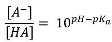 Rearrangement of the formula gives us the ratio of the concentrations of undissociated free acid [HA] and dissociated salt [A-] as a function of solution pH and the acid dissociation constant, pKa.