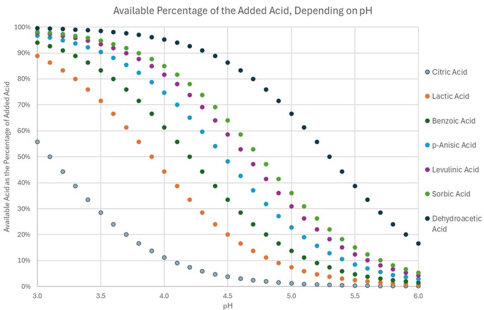 pKa is a substance-specific, solvent-dependent constant and, at least for a solution in pure water, the pKa values for common organic acids are well known. With this data in mind, we can easily plot the percentage of available free acid (HA) as a function of pH for various organic acids. For this plot we chose commonly known examples used for the preservation of cosmetic formulations, namely Citric Acid (pKa = 3.1), Lactic Acid (pKa = 3.9), Benzoic Acid (pKa = 4.2), p-Anisic Acid (pKa = 4.5), Levulinic Acid (pKa = 4.7), Sorbic Acid (pKa = 4.8) and Dehydroacetic Acid (pKa = 5.3) (6).