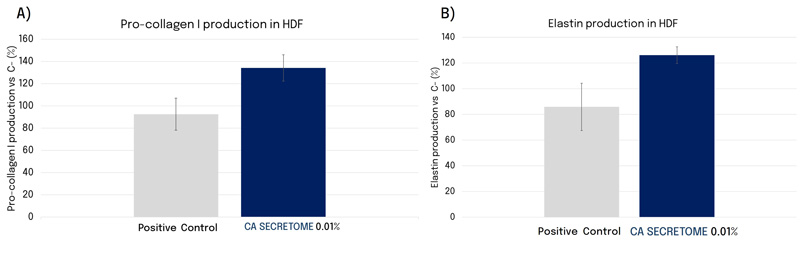 The C. asiatica secretome was tested on human dermal fibroblasts (HDFs) under serum-starved conditions to assess its ability to stimulate key dermal matrix components. At a concentration of 0.01%, the treatment led to a 34% increase in pro-collagen I and a 26% rise in elastin synthesis versus untreated controls (Figure 5, A-B).