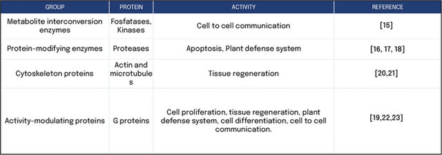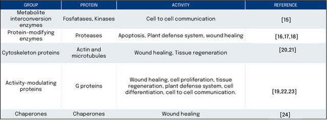 A bibliographic review was conducted to explore the different functionalities that these groups of proteins can have. Specifically, for example, the group of metabolite interconversion enzymes was related to cell-to-cell communication functionalities and cytoskeleton proteins; activity-modulating proteins and chaperone groups can be related to wound healing, tissue regeneration, and cell-to-cell communication functionalities (Table 1)(16, 17, 18, 19, 20).