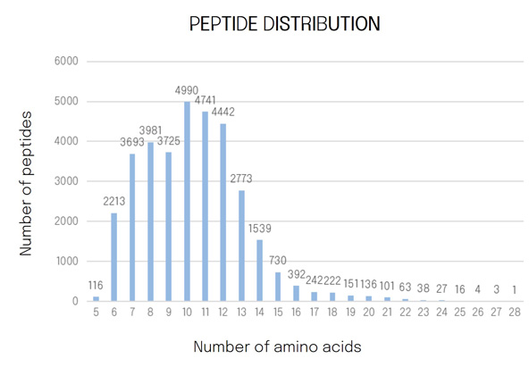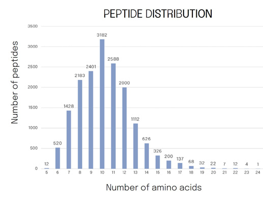 The CA peptidome identified 16,861 distinct peptides, primarily consisting of 75% peptides with 8-12 amino acids, with sequences of 10 amino acids being the most abundant length (Figure 3).