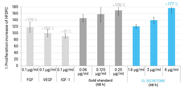 Figure 6. Proliferation index (%) on treated HFDPC normalized by non-treated cells. HFDPC were treated with different growth factors (FGF, IGF, and VEGF), gold standard, or the secretome of CL cell culture for 24 h and 48 h. Results are normalized to untreated control cells.