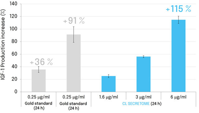 Furthermore, C. longa secretome significantly stimulated Insulin Growth Factor (IGF-1) production release in HFDPCs within 24 hours, with up to 115% increase relative to untreated cells. This growth factor is known to regulate follicular development and anagen phase induction, further highlighting the regenerative potential of the secretome (Figure 7).