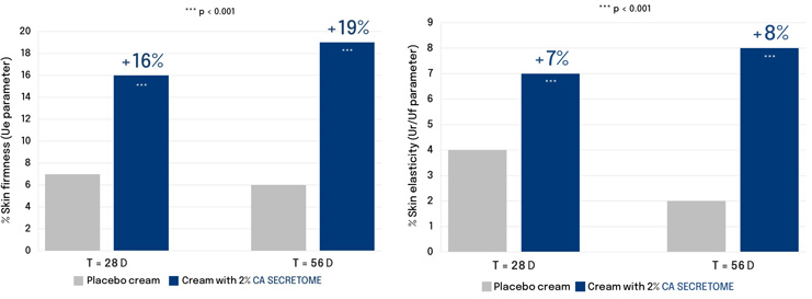 A placebo-controlled, double-blind clinical trial was conducted on women aged 51–59 to assess anti-aging efficacy of C. asiatica secretome. Firmness and elasticity were quantified using a Cutometer®. After 28 days, skin firmness improved by 36% and reached 46% by day 56. Elasticity demonstrate parallel gains of 21% (Figure 8, A-B).