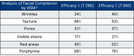 Table 3.Analysis of facial complexion using VISIA® and % efficacy facial complexion parameters, measured by means of a morphometric image analysis technique on standardized picture taken using VISIA®-CR (Canfield Imaging Systems Europe, Utrecht, Netherland). Quantitative evaluation was performed using morphometric image analysis to determine percentage changes in skin features.