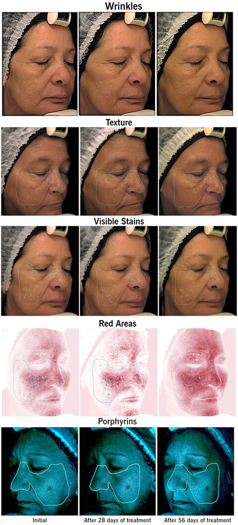 Figure 9. The analysis of facial complexion parameters is measured by means of a morphometric image analysis technique on a standardized picture taken using VISIA®-CR (Canfield Imaging Systems Europe, Utrecht, Netherland). Figure 9. The analysis of facial complexion parameters is measured by means of a morphometric image analysis technique on a standardized picture taken using VISIA®-CR (Canfield Imaging Systems Europe, Utrecht, Netherland).
