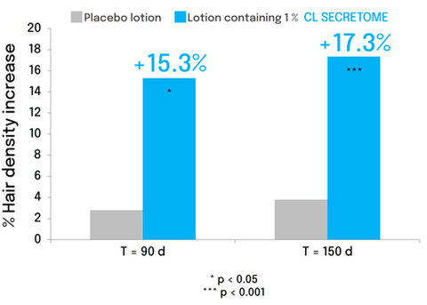 In a 150-day double-blind clinical study involving subjects with various forms of alopecia, C. longa secretome (1%) demonstrated a statistically significant increase in hair density. Group comparisons were analyzed using paired t-tests or ANOVA, with p-values < 0.05 considered statistically significant. Quantified via TrichoScan® imaging, average density increased by 15.3% at 90 days and 17.3% at 150 days compared to baseline (Figure 10).