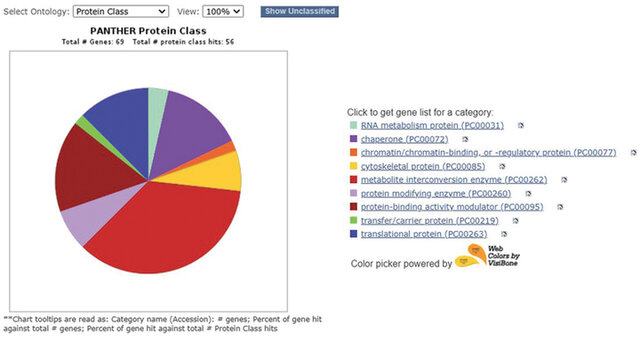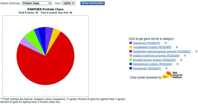 Figure 1. Protein characterization of Centella asiatica by means of PANTHER DB software. The study utilized the model plant Arabidopsis thaliana as a basis. Protein annotations were based on homology to Arabidopsis thaliana sequences.