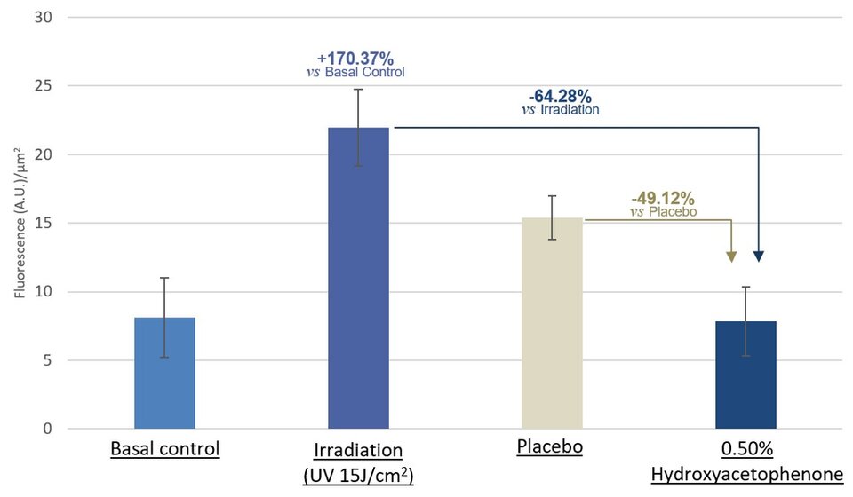 Figure 2. Ex vivo fluorescence data showing the reduction of oxidative stress on scalp fragments when treated with a scalp serum containing 0.50% Hydroxyacetophenone.