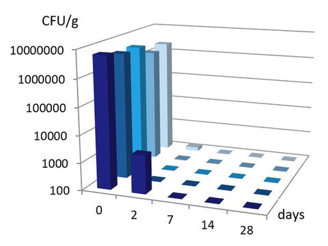 Figure 5. Challenge test results of 0.2% Hydroxyacetophenone + 0.5% Sodium Benzoate in a shampoo formulation; E. coli, P. aeruginosa, S. aureus, C. albicans, A. brasiliensis