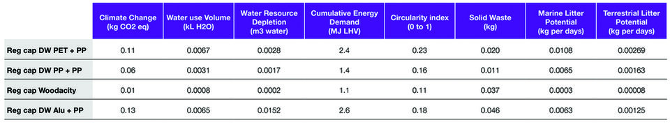 Figure 1. LCA comparison of a monomaterial Woodacity® cap and others made with PET, PP and aluminium. Wood shows a lower impact in all metrics besides circularity and solid waste, as LCA tools currently do not factor in the biological loop and focus on domestic recycling, even though wood is mostly safe to discard or incinerate.